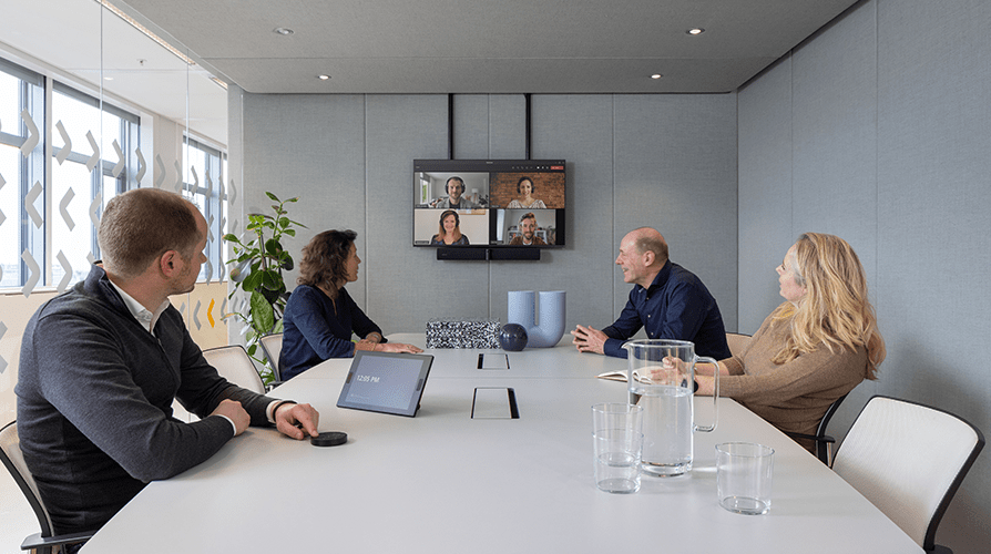 Our PanaCast 50 Video Bar System ensures that individual participants in an online meeting are all equal conversation partners. One way this is achieved is through the 'Dynamic Composition' feature, in which the intelligent camera takes a close-up of the in-room participants and gives them individual-sized tiles, enabling a realistic face-to-face experience, even for remote attendees.